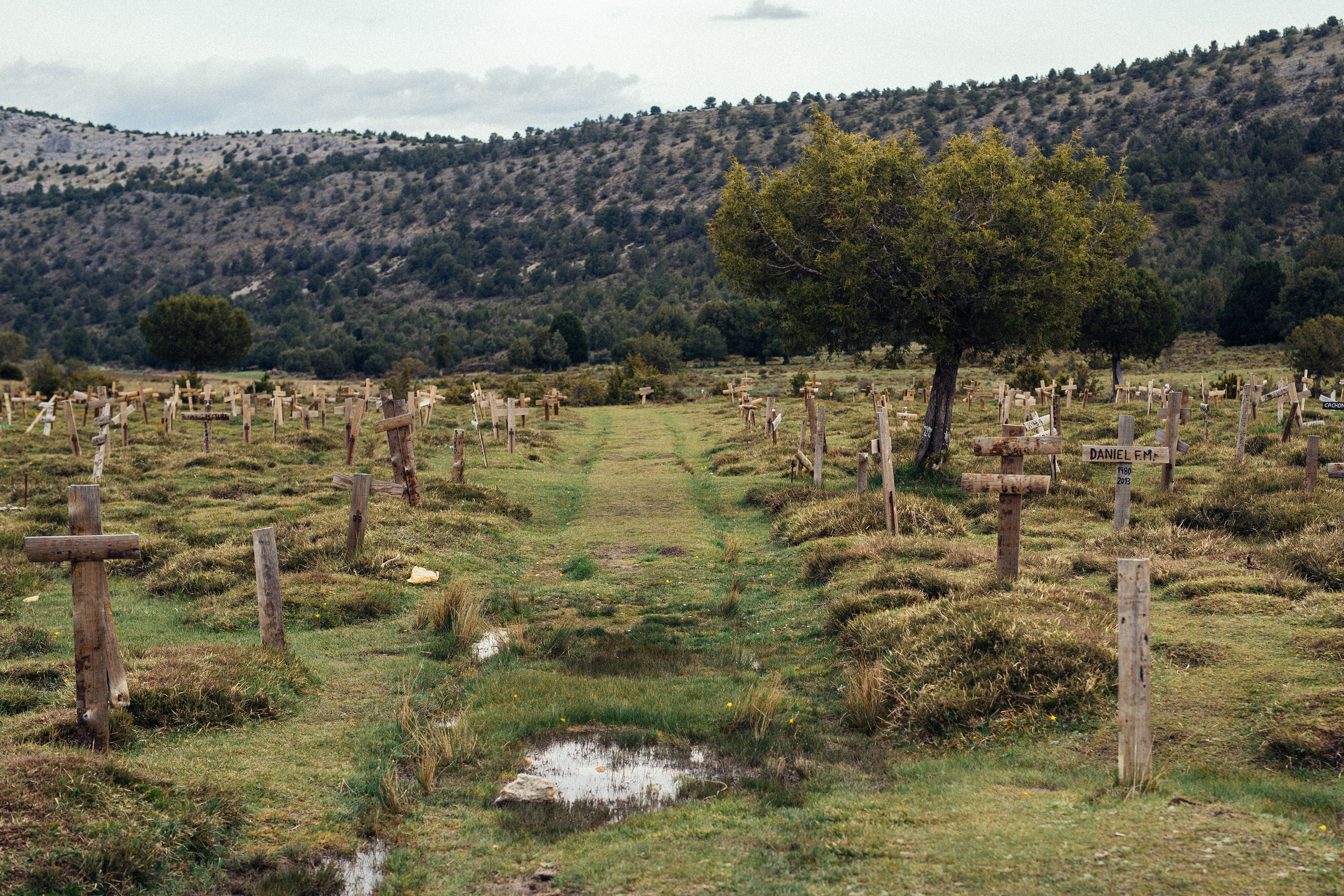 The set (still visible today) was built according to the designs of the set designer Carlo Simi in just 3 days by 250 soldiers of the Spanish army recreating a superb circular cemetery with more than 5,000 graves arranged in a system of concentric circles and radii surrounding a central paved square. 30 meters where the climax is located.